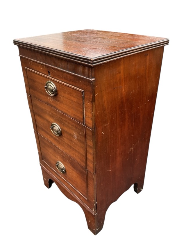 A small mahogany cabinet with fluted edged rectangular top above a ribbed frieze, having three drawers mounted with oval brass handles, the shaped apron with bracket feet. (16.75in x 14.75in x 30in)