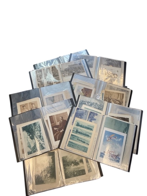 Nine folders containing a large collection of over 150 WWI period photographs and artists illustrations from periodicals - battle scenes, military leaders, news reports, aerial and naval combat, famous actions, airships, etc. (9)