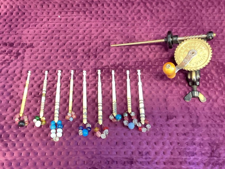 Nine antique turned bone lacemakers bobbins with thistle finials and coloured glass bead weights; and a Swedish mechanical cast iron and brass thread spool winder with table clamp. (10)