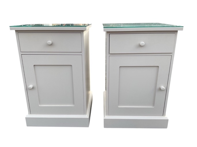 A pair of contemporary white painted bedside cabinets, with plate glass tops above cupboards. (2) (17.5in x 17.5in x 26.75)