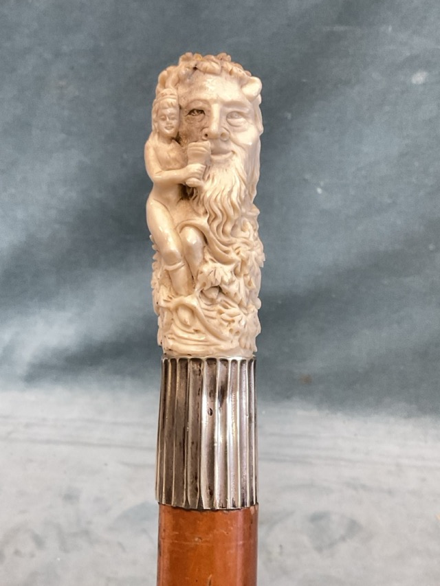 A Victorian malacca cane with intricately carved antler pommel depicting a nude nymph holding a goblet to Pan’s mouth amid vines having fluted collar. (34.5in)