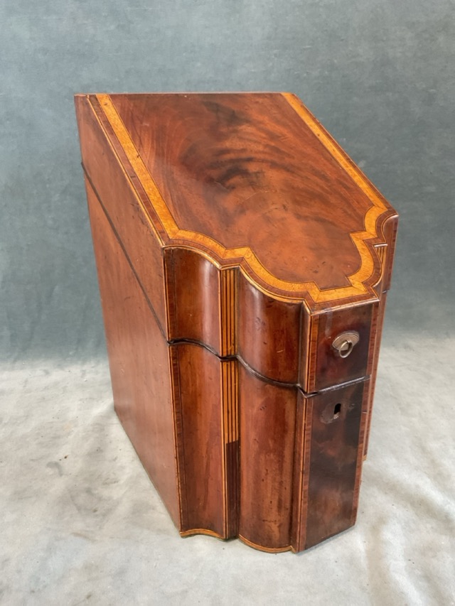 A Georgian boxwood & ebony strung and satinwood & rosewood crossbanded mahogany knife box with sloped cover, converted to a tantalus containing a cut glass decanter and a pair of glasses. (8.75in x 12in x 14.5in)