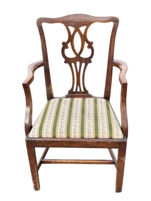 An early nineteenth century mahogany elbow chair of Chippendale style with shaped back above pierced splat and drop-in upholstered seat, raised on square chamfered legs joined by rectangular stretchers.