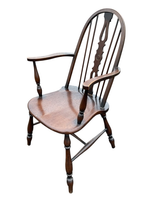 A windsor chair having hooped back above splat with carved roundel flanked by spindles, the saddle shaped seat on turned legs & stretchers.