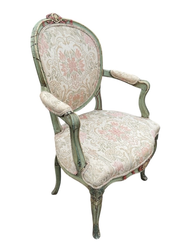 A C19th French fauteuil with painted decoration, the upholstered back with ribbon carving framing an oval portrait medallion, the channelled moulded frame with scrolled supports to arms around a sprung upholstered bowfronted seat, the rails with conforming decoration, raised on cabriole legs.