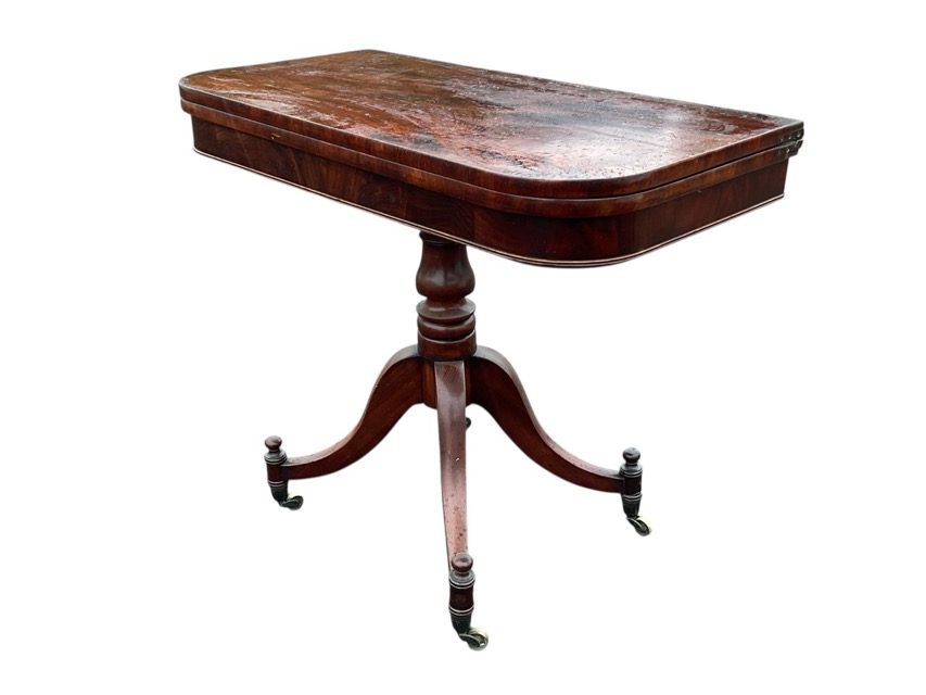 A C19th turn-over-top mahogany tea table, with rounded twin leaves on turned column, supported on hipped quadripartite legs with brass castors. (35.75in x 17.5in x 29in)