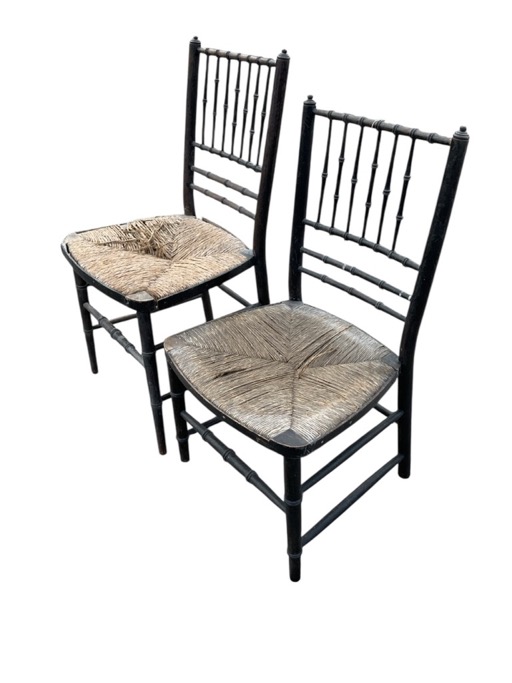 A pair of Victorian rush seated chairs with fine spindle turned backs on ring-turned tapering legs & stretchers - one reduced. (2)