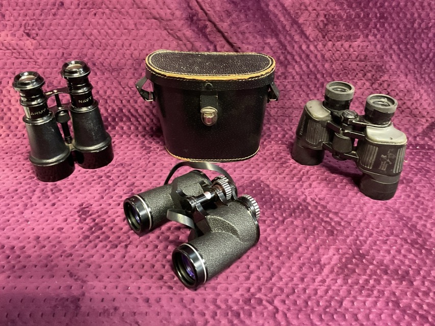 A pair of 1916 WWI French made binoculars; a leather cased pair of Swallow 9 x 40 wide angle binoculars; and a pair of Bushnell 13-201C 10 x 42 binoculars. (3)