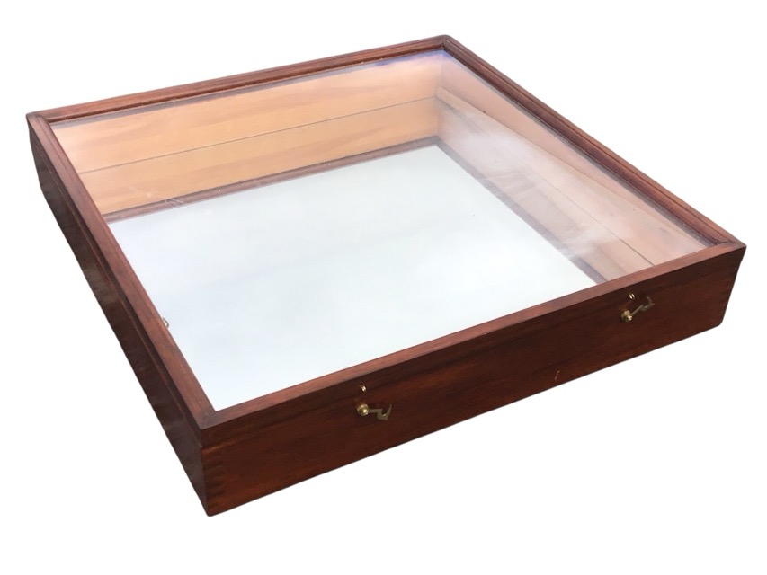 A square pine display case of dovetailed construction with mirror back and hinged glazed lid. (23.75in x 23.75in x 4.5in)