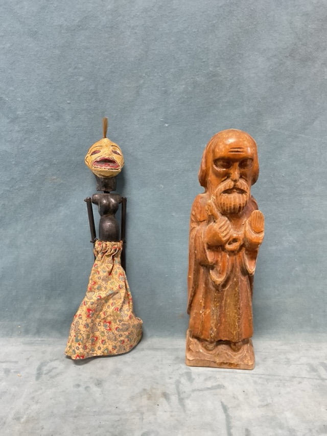 A carved hardwood figure of Saint Peter - 13.25in; and an Indonesian rod puppet with papier-mâché head of a woman wearing a sarong - 14in. (2)