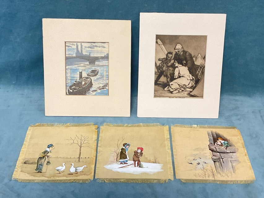 Percy Telford, three-colour woodcut, Thames Barges near Battersea, titled on label to verso, mounted; William Strang, etching and aquatint, an illustration from Kipling titled William the Conqueror, signed in the print, mounted; and three Victorian handpainted silks with Kate Greenaway style scenes. (5)