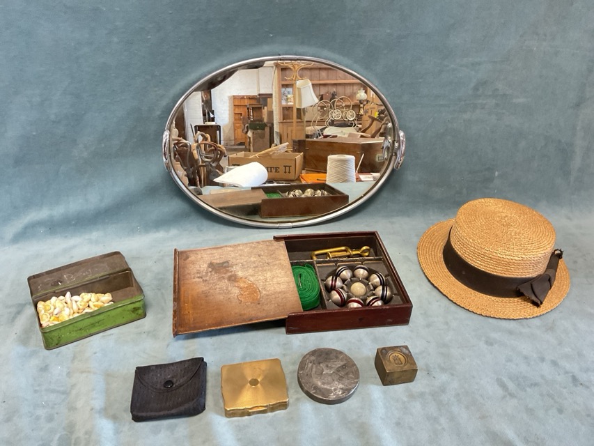 An oval deco chrome mirror tray; a tin of cowrie shells; an unusual mahogany boxed table game; an Edwardian straw boater; a 50s Stratton gilt musical compact; a Victorian circular lead paperweight cast with a pelican; and a bronze seal matrix with a marquess coat of arms. (7)
