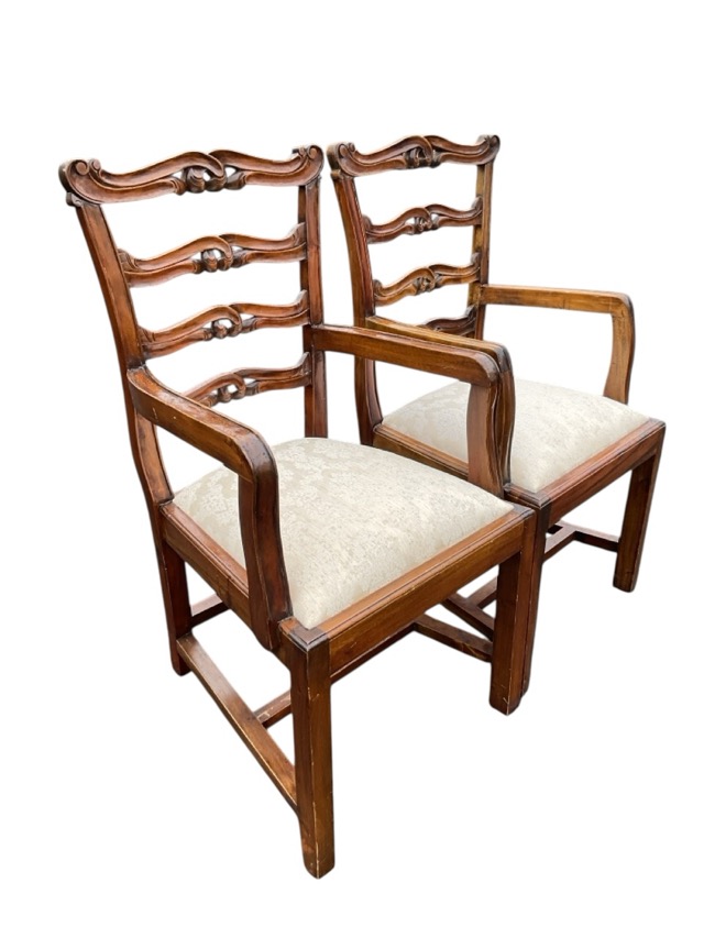 A pair of Georgian style ladderback armchairs with pierced scroll carved rails above channelled arms and drop-in damask upholstered seats, raised on square tapering legs. (2)