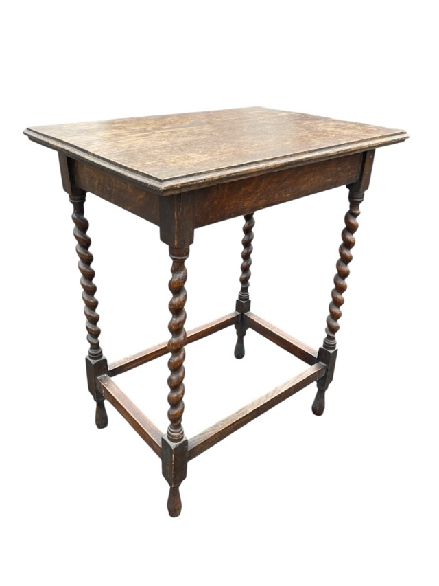 A rectangular oak side table with moulded top on barleytwist legs joined by square stretchers, having turned feet. (23.5in x 16.25in x 28.5in)