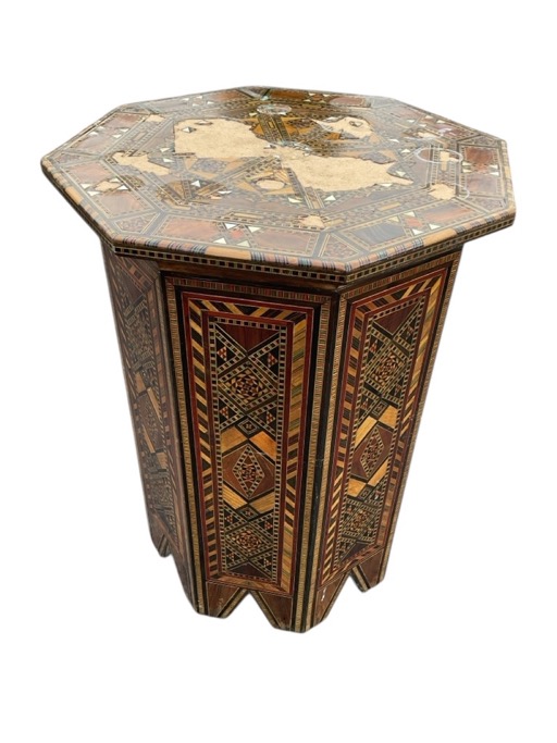 An octagonal North African marquetry occasional table decorated with geometrically inlaid panels in specimen woods, the top fucked. (19.5in x 24in)