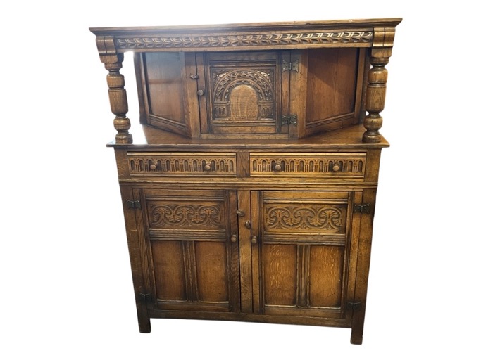 A carved oak court cupboard with moulded top and chip-carved apron supported on turned columns framing a cupboard with arched door, the base with two frieze drawers above panelled door cupboards. (45.25in x 15.5in x 56.75in)