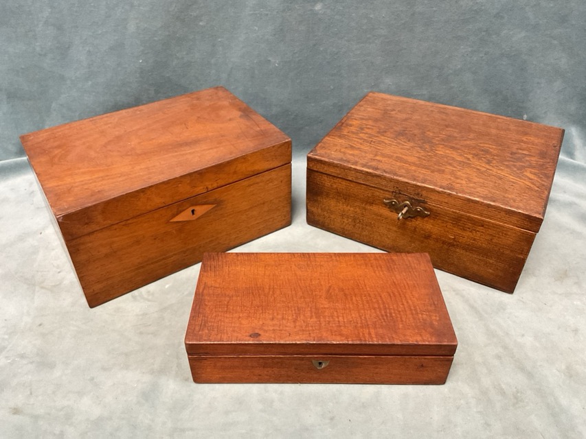 A Victorian mahogany box with diamond shaped escutcheon; an Edwardian oak box with brass escutcheon; and a rectangular velvet lined C19th box with brass shield shaped escutcheon. (3)