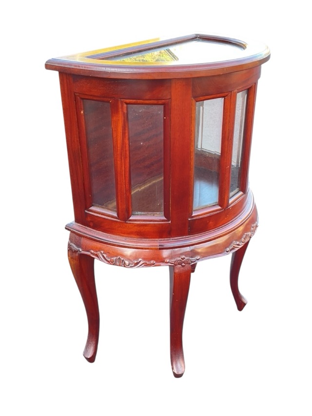 A mahogany bijouterie cabinet of moulded D-shape outline having hinged cover above seven bevelled glass panels, the apron with foliate scrolled carving, raised on cabriole legs. (19in x 11.5in x 28.75in)