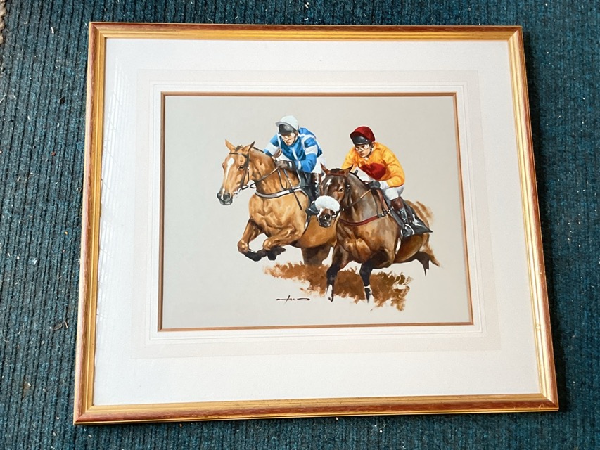Graham Isom, oil on board, two racehorses jumping a fence, signed, mounted and gilt framed. (15in x 13.5in)