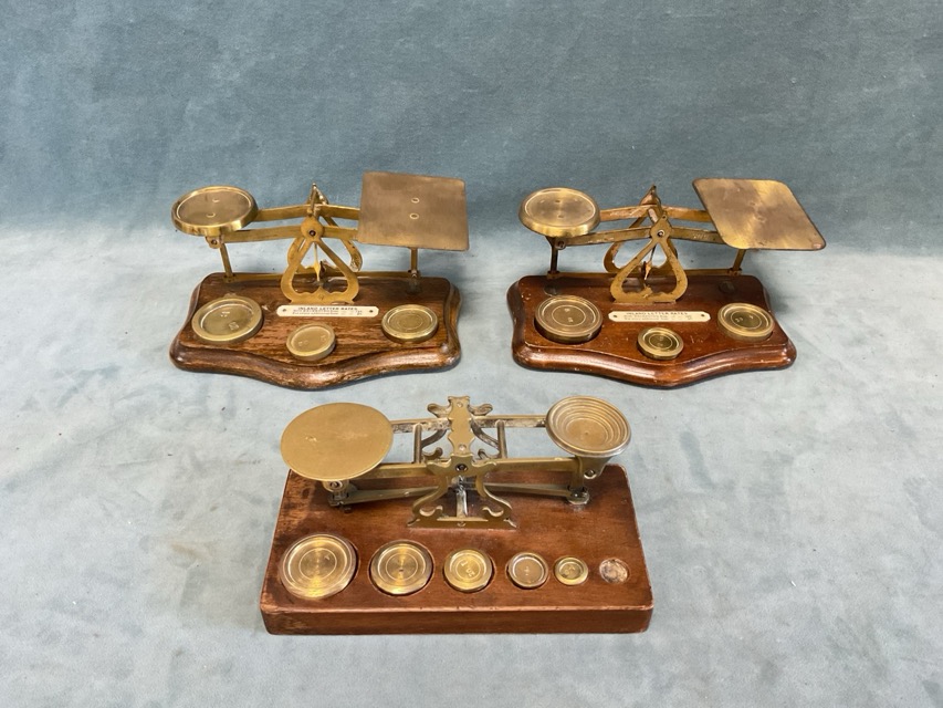 Two similar Edwardian brass letter scales with pierced supports and brass weights on serpentine mahogany bases; and another Victorian example by Samuel Morgan & Co of London on a rectangular mahogany plinth. (3)