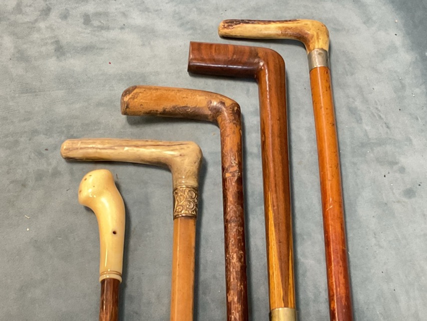 Five antique walking canes - oak with a zigzag spliced mahogany handle; a malacca cane with foliate embossed gilt metal collar; another with plain collar; hazel with angled handle; and cane with bone pommel. (5)