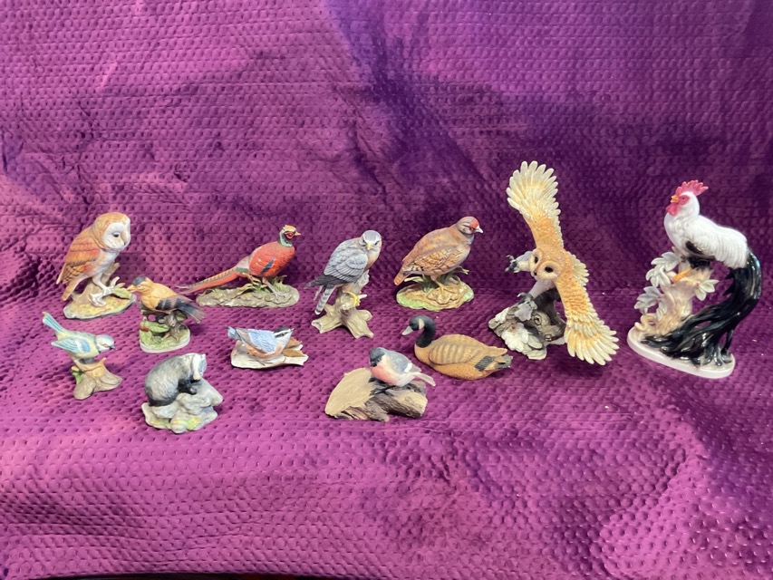 A collection of bird figurines - owl, pheasant, merlin, partridge Maruri, nuthatch, Brooks & Bentley, bluetit, golden oriole, long-tailed cockerel, swooping owl, Canada goose, bullfinch; and an unmarked porcelain badger. (12)