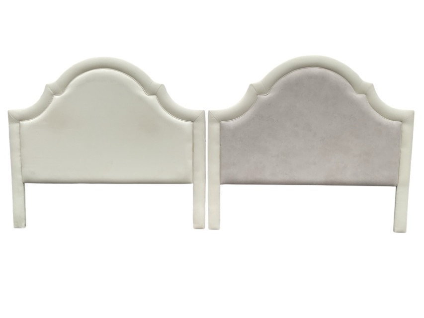 A pair of contemporary ivory coloured leather upholstered super-king size headboards with arched panels in cushion framed borders - from Savoy Hotel London, Etc.. (76.5in x 67in) (2)