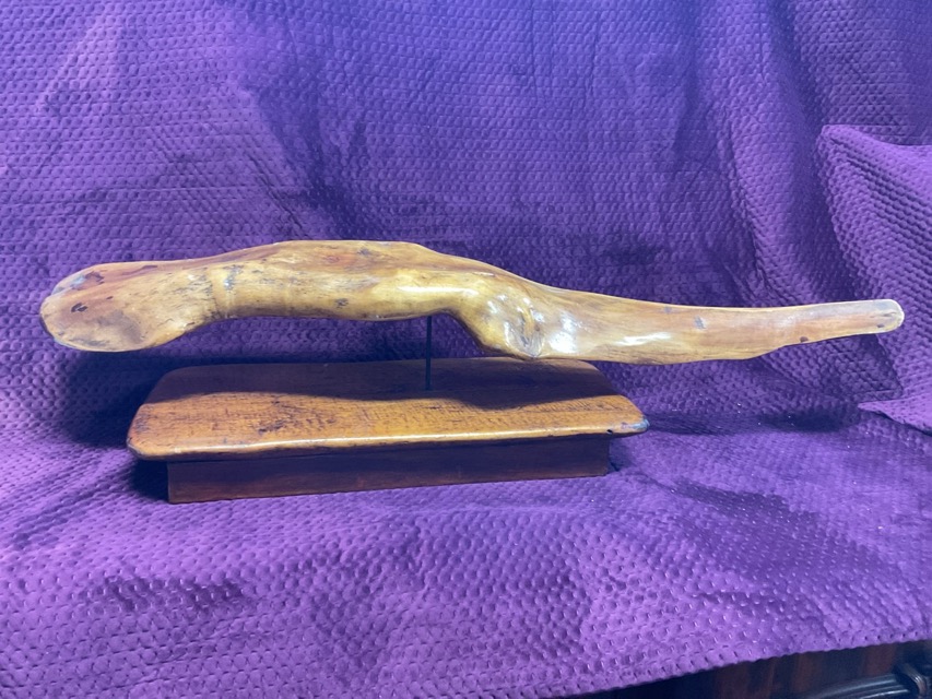 An abstract polished hardwood sculpture resembling a fish, mounted on a rectangular oak plinth. (42in x 10.5in x 10in)