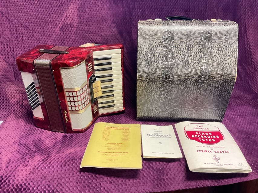 A faux-crocodile cased Galotta 48 bass two-octave accordion with red pearlised marbled case, and two piano-accordion tutor books; and a flageolet whistle tutor pamphlet.