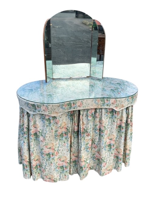 A 70s Lusty kidney shaped dressing table with plate glass to top, covered in floral printed cotton with pleated running curtain surround beneath an apron, the interior with drawer & shelves. (42in x 24in)
