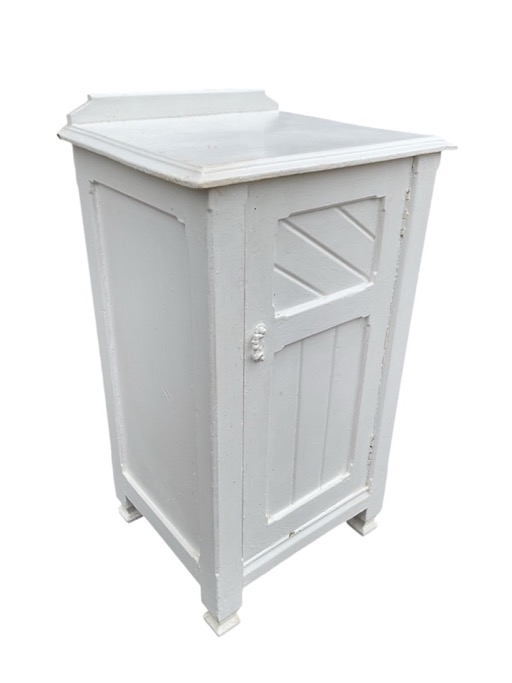 A painted Edwardian pot cupboard with tongue & grooved chamfered panels to door, raised on shaped waisted feet. (17in x 14.75in x 30.5in)