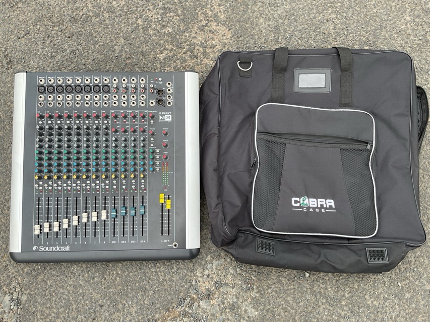 A cased Soundcraft digital mixing desk with eight chanels, jack & canon inputs, etc, as new. (20in x 20in)