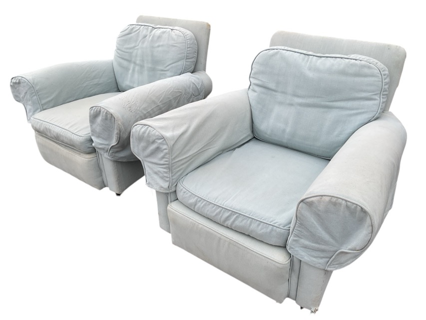 A pair of contemporary country armchairs with long seats and loose cushions, raised on bun feet with brass castors. (2)