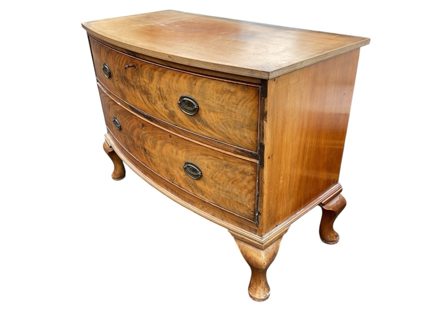 A satinwood crossbanded bowfronted mahogany chest of two long cockbeaded drawers, raised on cabriole legs. (21.75in x 43.5in x 32.5in)