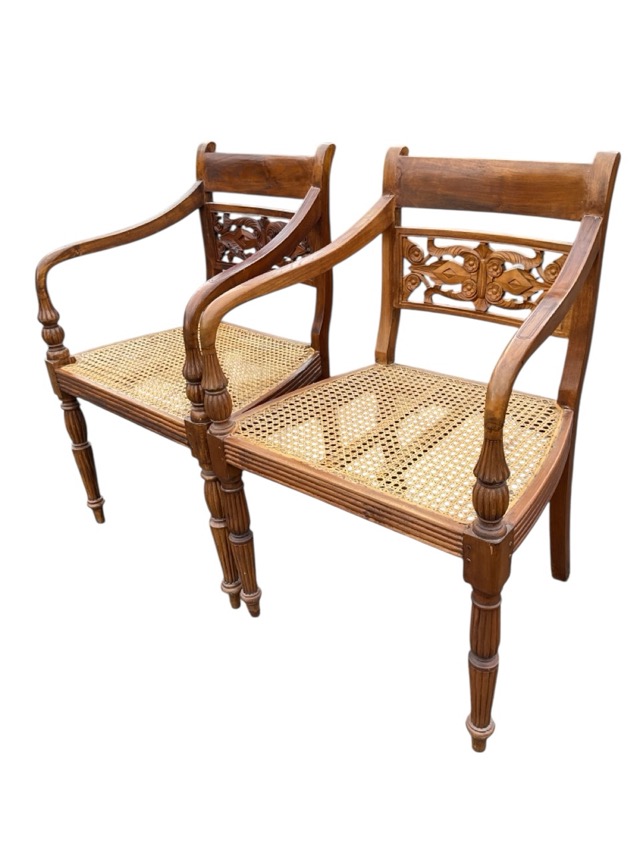 A pair of mahogany elbow chairs with pierced carved backs and cane seats framed by downswept arms on fluted supports, the ribbed rails raised on conforming turned legs. (2)
