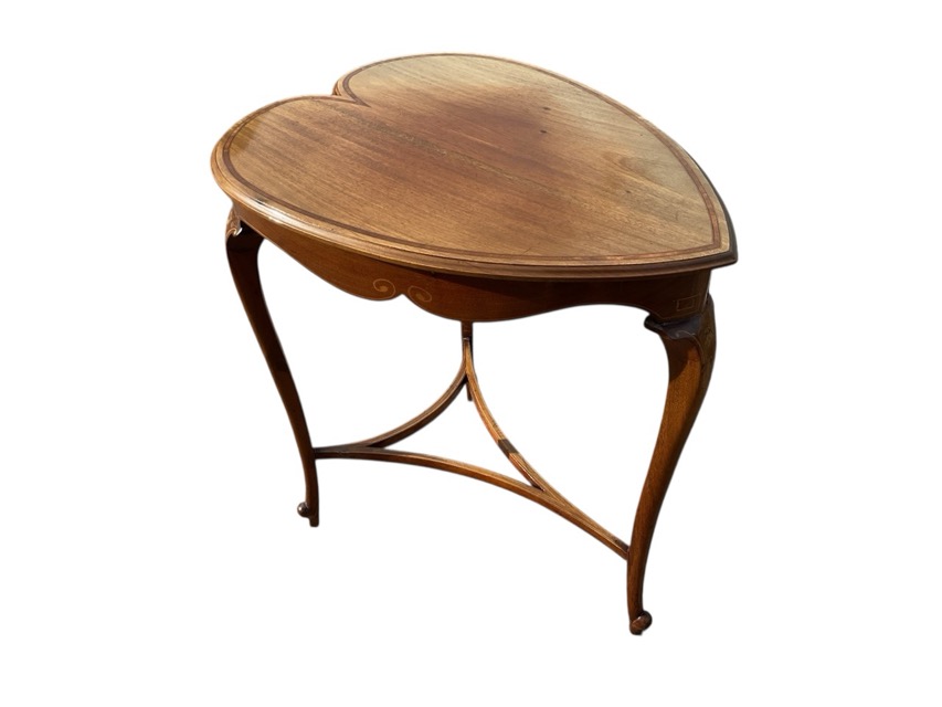 A heart shaped Edwardian mahogany occasional table with crossbanding to moulded top, raised on three cabriole legs - all decorated with boxwood inlay. (25.5in x 19.5in x 28.5in)