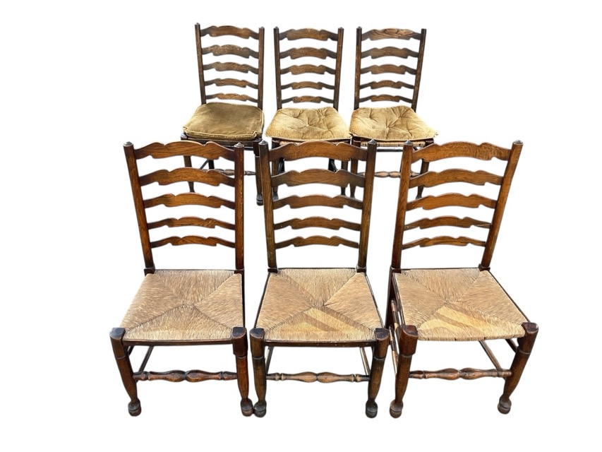 A set of six oak ladderback dining chairs, with five rails above rush seats, raised on skittle turned legs with ball feet. (6)
