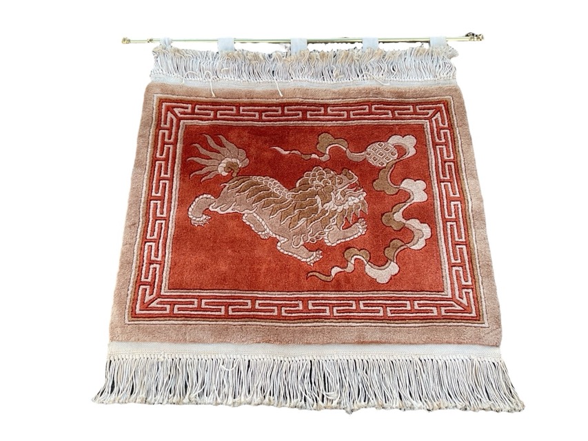 A wall hanging with brass pole suspending thick-pile wool panel woven with lion chasing pearl & clouds within a greek key band on russet ground. (30in x 24in)