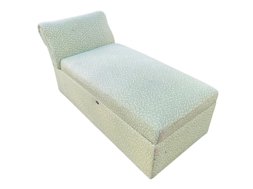 A contemporary upholstered chaise with padded rest and rectangular sprung upholstered box seat, raised on block feet. (56.5in)