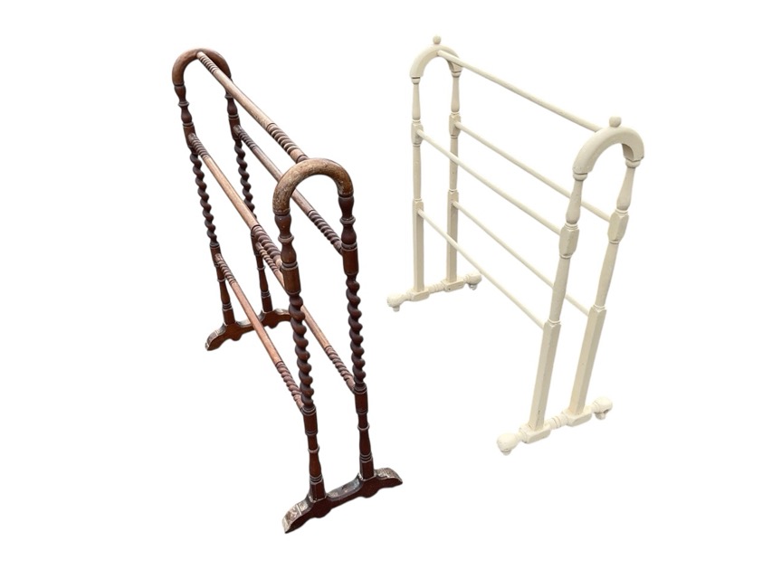 A mahogany towel stand with five rails on twin twisted turned columns beneath arches, having shaped feet; and another painted with twin turned columns on square supports. (29in & 27.5in) (2)