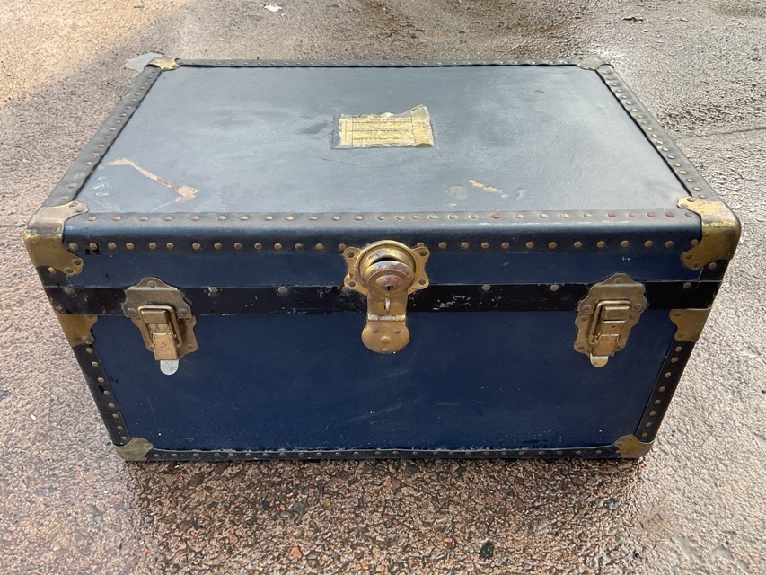 A rectangular trunk with brass mounts and studding, leather handles and lined interior. (30in x 20.25in x 16.25in)