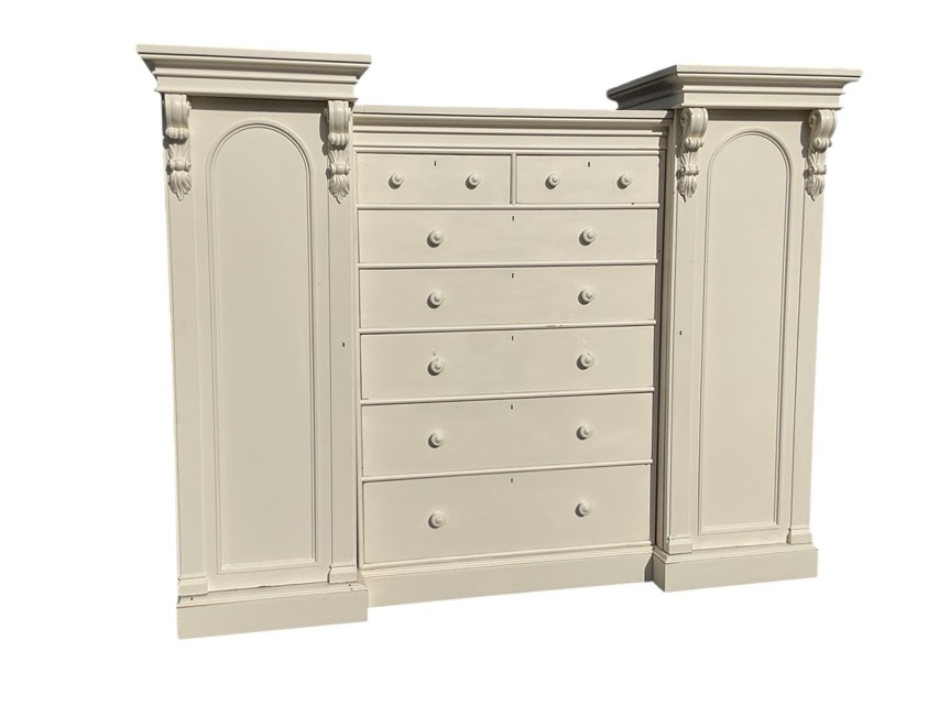 A painted Victorian mahogany breakfront sentry wardrobe with central tallboy of seven knobbed drawers flanked by panelled door cupboards enclosing hanging space, with scrolled carved corbels and moulded cornices. (99in x 26in x 79in)