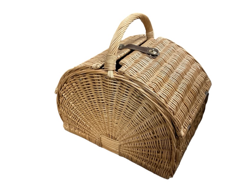 A large cane picnic hamper of arched fan shape with lined interior having leather mounts, the basket with twisted loop handle. (20in x 20in)