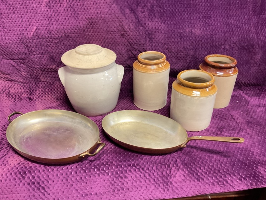 A glazed stoneware covered crock; three stoneware storage jars; a French copper oval pan with riveted brass handle; and a similar oval two-handled gratin dish. (6)