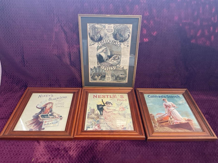 A Victorian gilt framed advertisement for Beecham Pills dated 1888; and a set of three pine framed reproduction advertising posters - Nestle Food, Colemans Starch & Nixeys Black Lead. (4)