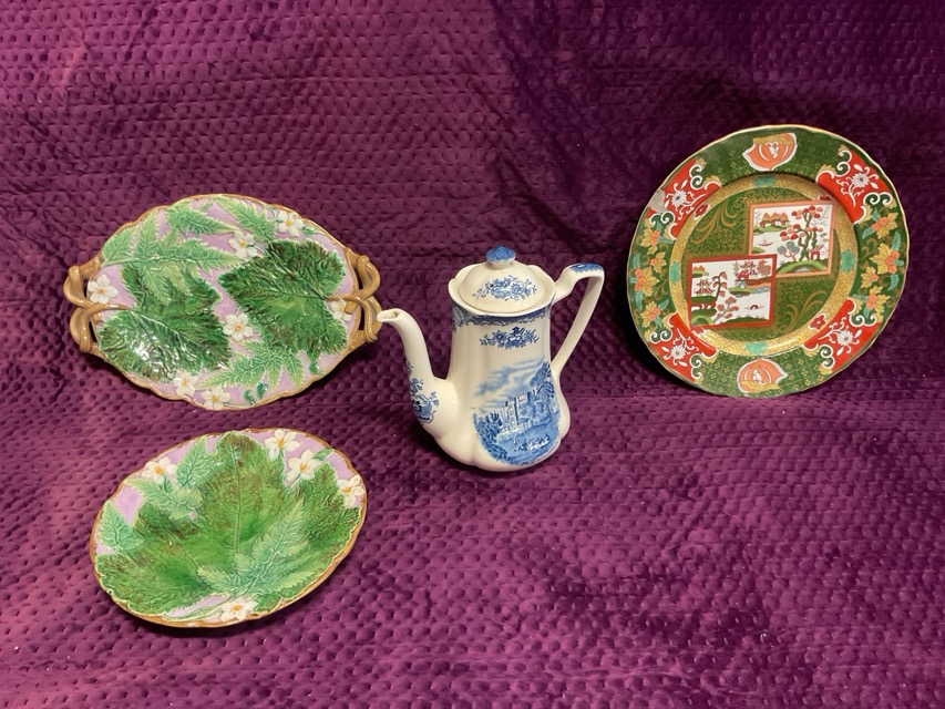 A Victorian ironstone Ashworth chinoiserie plate; two nineteenth century majolica platters embossed with leaves & flowers on lilac ground - oval & circular; and a blue & white coffee pot & cover - Johnstons. (4)