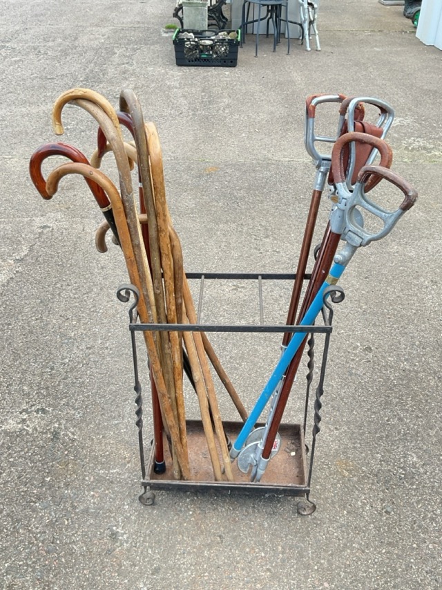A rectangular wrought iron umbrella stand with scrolled finials on twisted supports joined by a tray, with a collection walking sticks - hazel,cane,crook handled, etc; and shooting sticks by Featherwate, Gamebird, Mills, etc. (16)