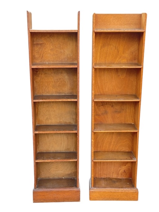 A pair of oak open bookcases, each with six shelves on moulded plinths. (13in x 5.25in x 49.75in) (2)