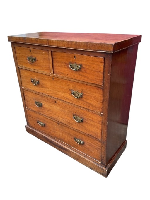 A Victorian mahogany chest with two short and three long drawers mounted with pierced brass handles, supported on plain plinth. (41in x 17.5in x 42.25in)