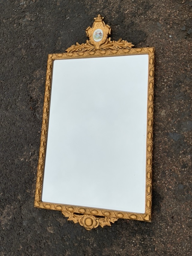 A Georgian style pier glass with rectangular bevelled plate in egg & ribbon moulded gilt frame, the shield crest with oval porcelain panel. (15in x 22.25in plate)